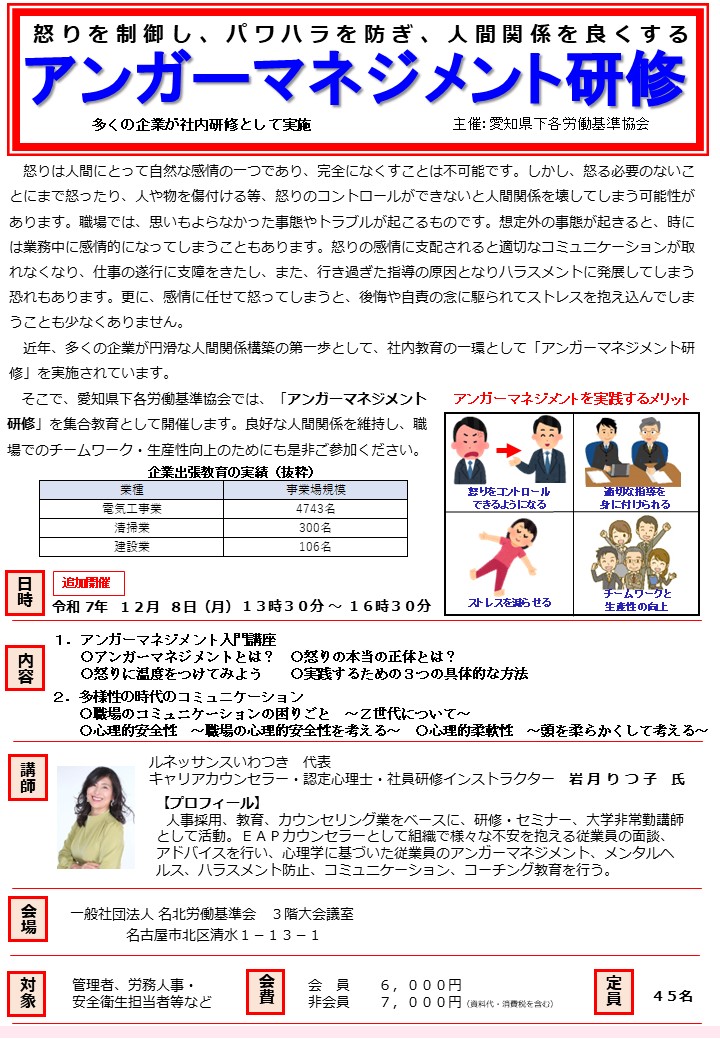 そこで、愛知県下各労働基準協会では、「アンガーマネジメント研修」を集合教育として開催します。良好な人間関係を維持し、職場でのチームワーク・生産性向上のためにも是非ご参加ください。