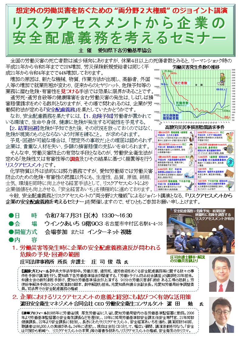 今般、安全配慮義務とリスクアセスメントの“両分野2大権威”によるジョイント講演となる、リスクアセスメントから企業の安全配慮義務を考えるセミナーを開催しますので、ぜひともご参加お願い申し上げます。