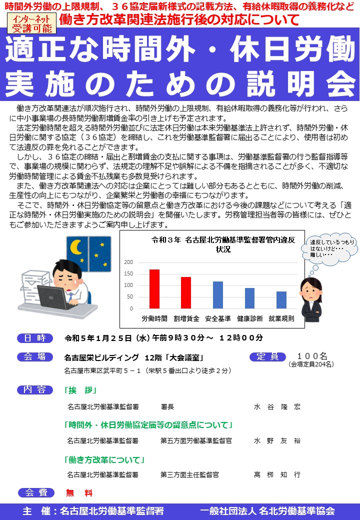 そこで、時間外・休日労働協定等の留意点と働き⽅改⾰における今後の課題などについて考える「適正な時間外・休日労働実施のための説明会」を開催いたします。労務管理担当者等の皆様には、ぜひともご参加いただきますようご案内申し上げます。