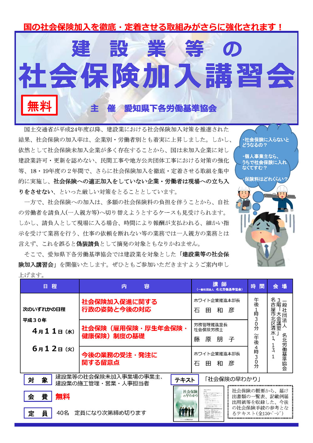 そこで、愛知県下各労働基準協会では建設業を対象とした「建設業等の社会保険加入講習会」を開催いたします。ぜひともご参加いただきますようご案内申し上げます。