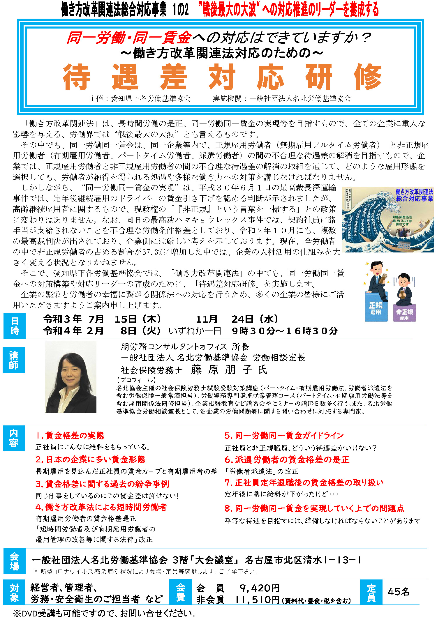 そこで、愛知県下各労働基準協会では、「働き方改革関連法」の中でも、同一労働同一賃金への対策構築や対応リーダーの育成のために、「待遇差対応研修」を実施します。