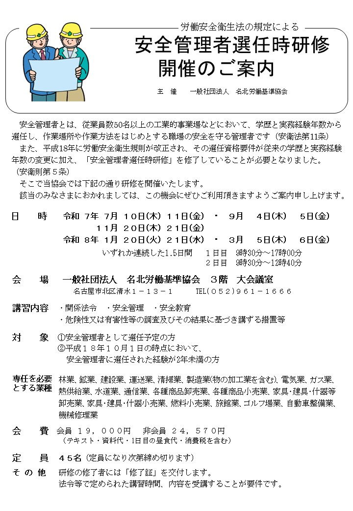 平成18年に労働安全衛生規則が改正され、この選任資格要件が変わり、従来の学歴と実務経験年数の変更に加え、「安全管理者選任時研修」を修了していることが必要となりました。(安衛則第5条)