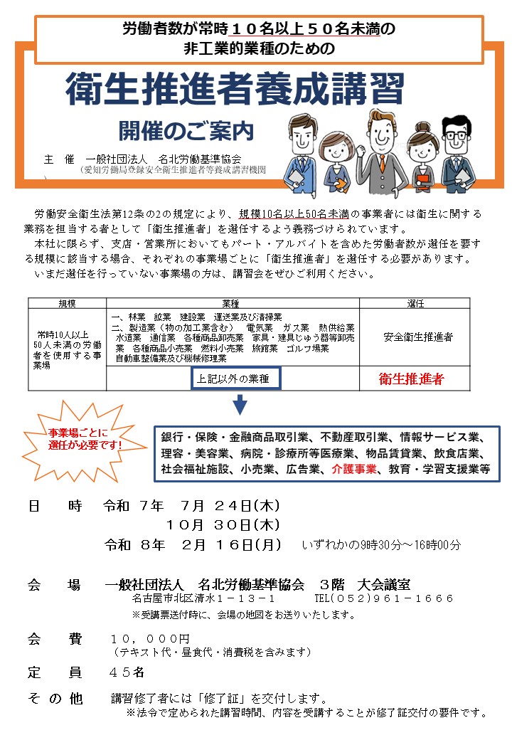 主催:一般社団法人 名北労働基準協会(愛知労働局長登録安全衛生推進者等養成講習機関)