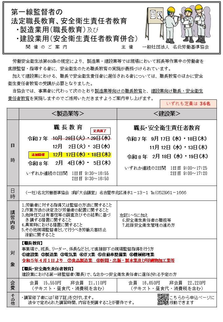 労働安全衛生法第60条の規定により、製造業・建設業等では作業現場において班長・リーダー等作業中の労働者を直接監督・指導する者に、安全衛生のため職長教育の実施が義務づけられています。