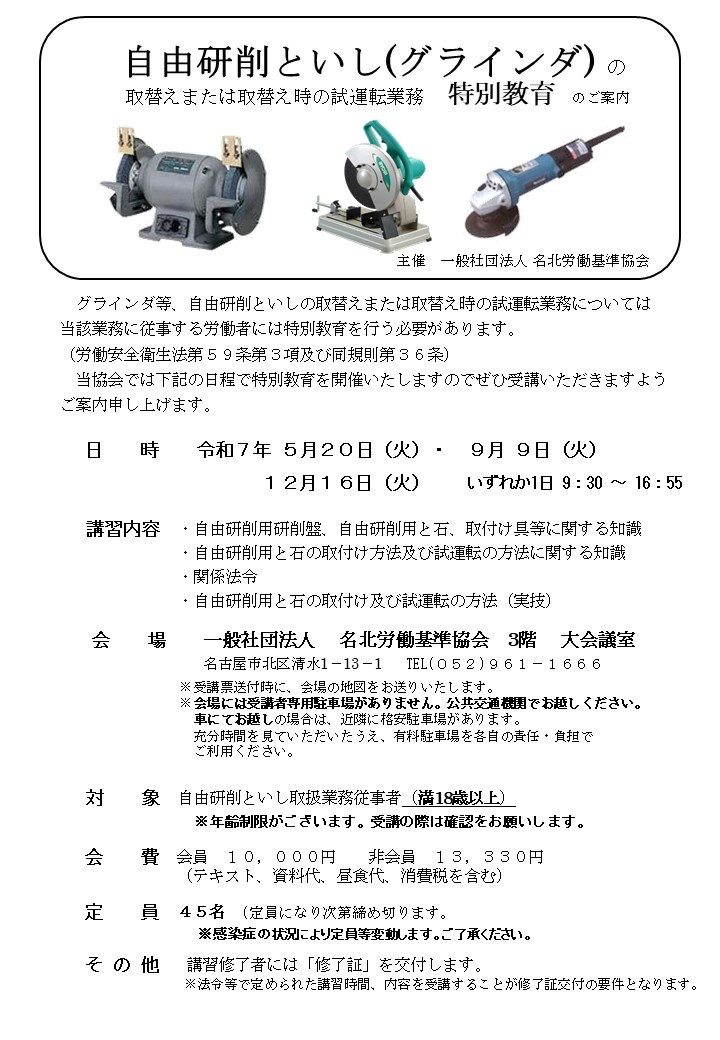 C11 自由研削砥石(グラインダ)取扱者(法定特別教育)講習会開催のご案内