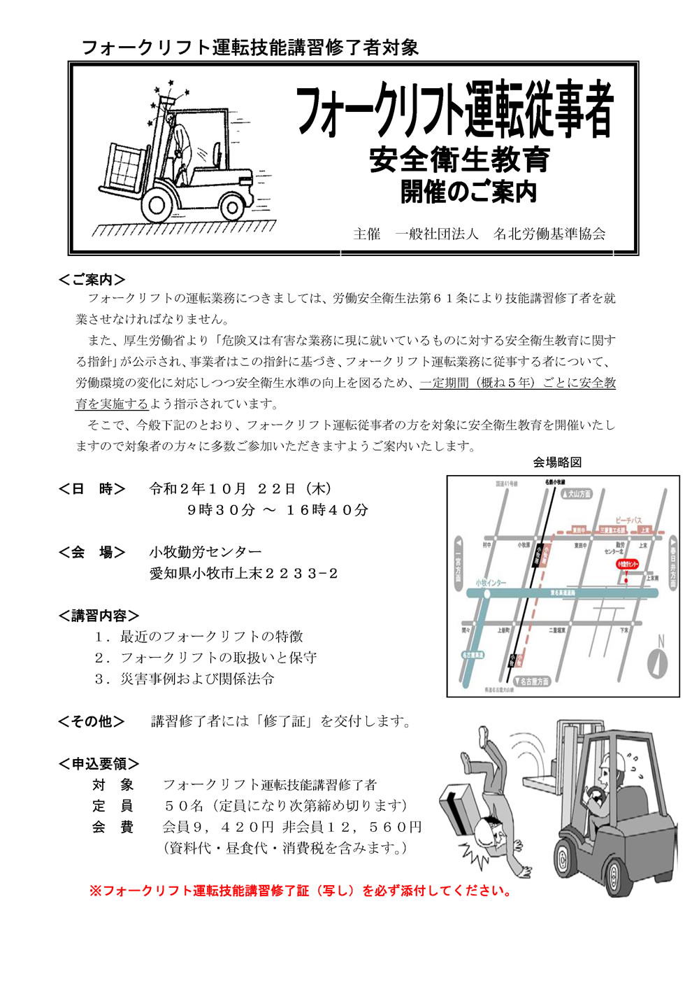 そこで、今般下記のとおり、フォークリフト運転従事者の方を対象に安全衛生教育を開催いたし