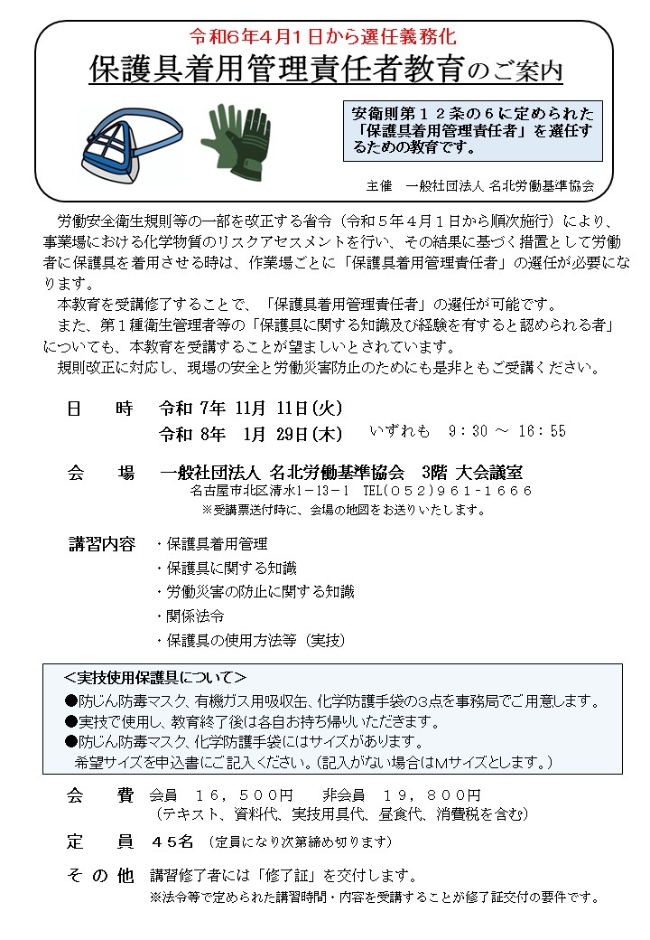 労働安全衛生規則等の一部を改正する省令(令和5年4月1日から順次施行)により、事業場における化学物質のリスクアセスメントを行い、その結果に基づく措置として労働者に保護具を着用させる時は、作業場ごとに「保護具着用管理責任者」の選任が必要になります。本教育を受講修了することで、「保護具着用管理責任者」の選任が可能です。