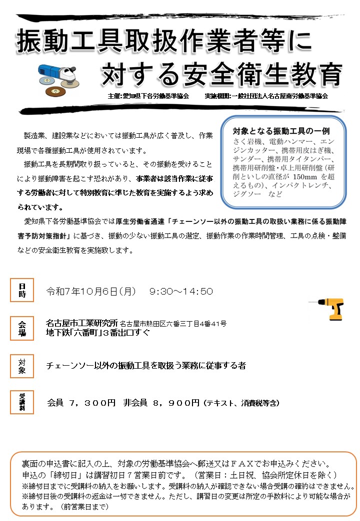 当協会では厚生労働省通達「チェーンソー以外の振動工具の取扱い業務に係る振動障害予防対策指針」に基づき、振動の少ない振動工具の選定、振動作業の作業時間管理、工具の点検・整備などの安全衛生教育を実施いたします。