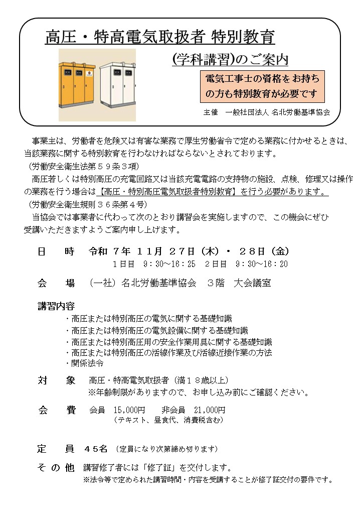高圧・特別高圧電気取扱者 法定特別教育(学科)のご案内