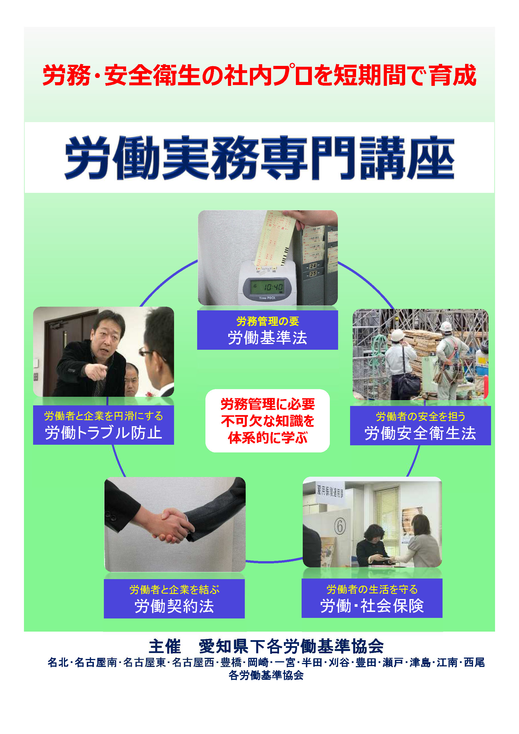 そこで、愛知県下各労働基準協会は、労働関係法令を短期間で体系的に学ぶ『労働実務専門講座』を開催いたします。ご関係の皆様にはぜひともご受講願います。